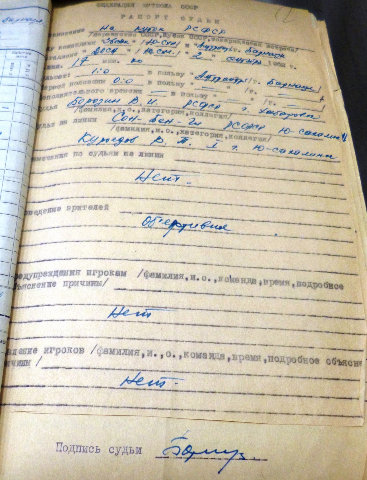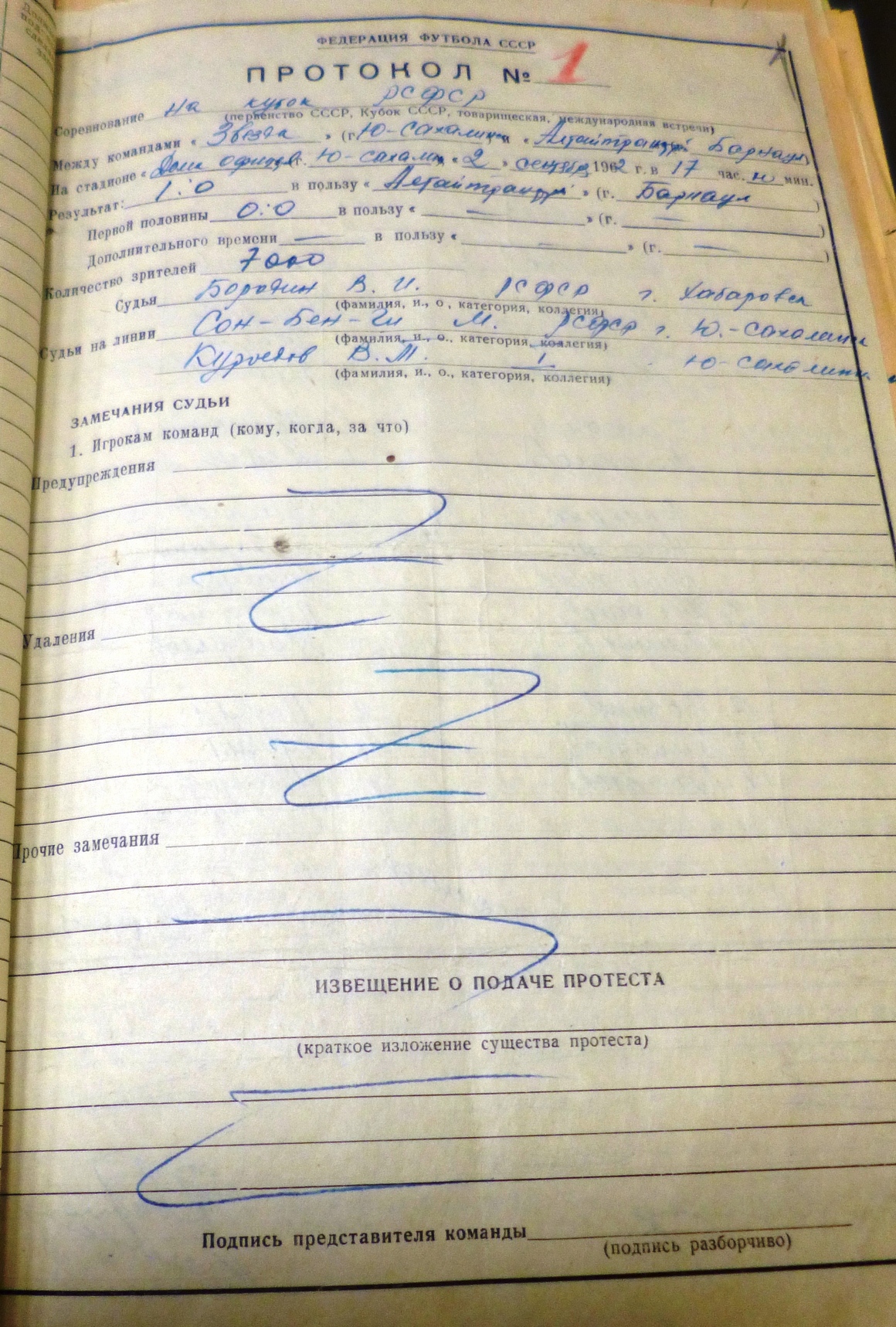02.09.1962. 1/4 финала Кубка РСФСР. г. Южно-Сахалинск. Стадион «ДОСА». 7000 зрителей. Судьи Василий Бородин (Хабаровск), Сон Бен Ги (Южно-Сахалинск), В.Т. Куроедов (Южно-Сахалинск).