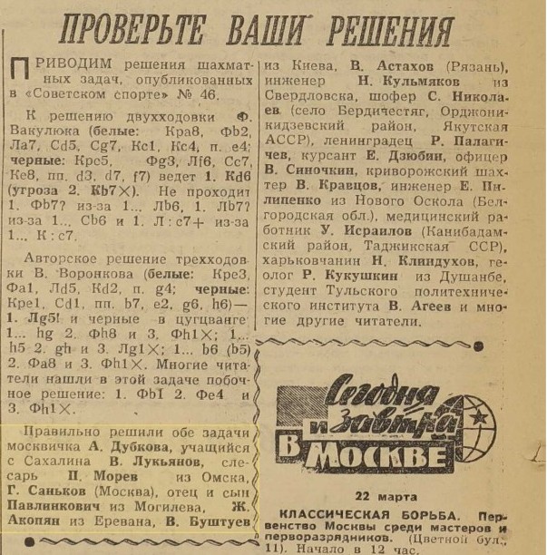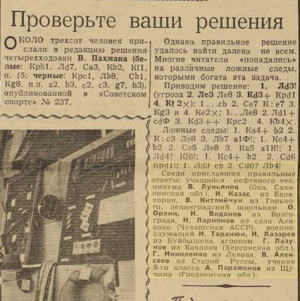 Чуть позже задачу охинца на мат в два хода опубликовал уже «Советский спорт», попутно написав о нем несколько строк.
