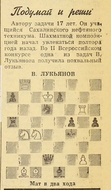 P.S. Творчество Валентина Лукьянова известно проблемистам всего мира. Однако его первые шахматные опыты до сих пор оставались за пределами внимания исследователей в силу их труднодоступности. Мы хотим попытаться устранить этот пробел и предлагаем вашему вниманию еще несколько задач Валентина Лукьянова, составленных им на Сахалине…