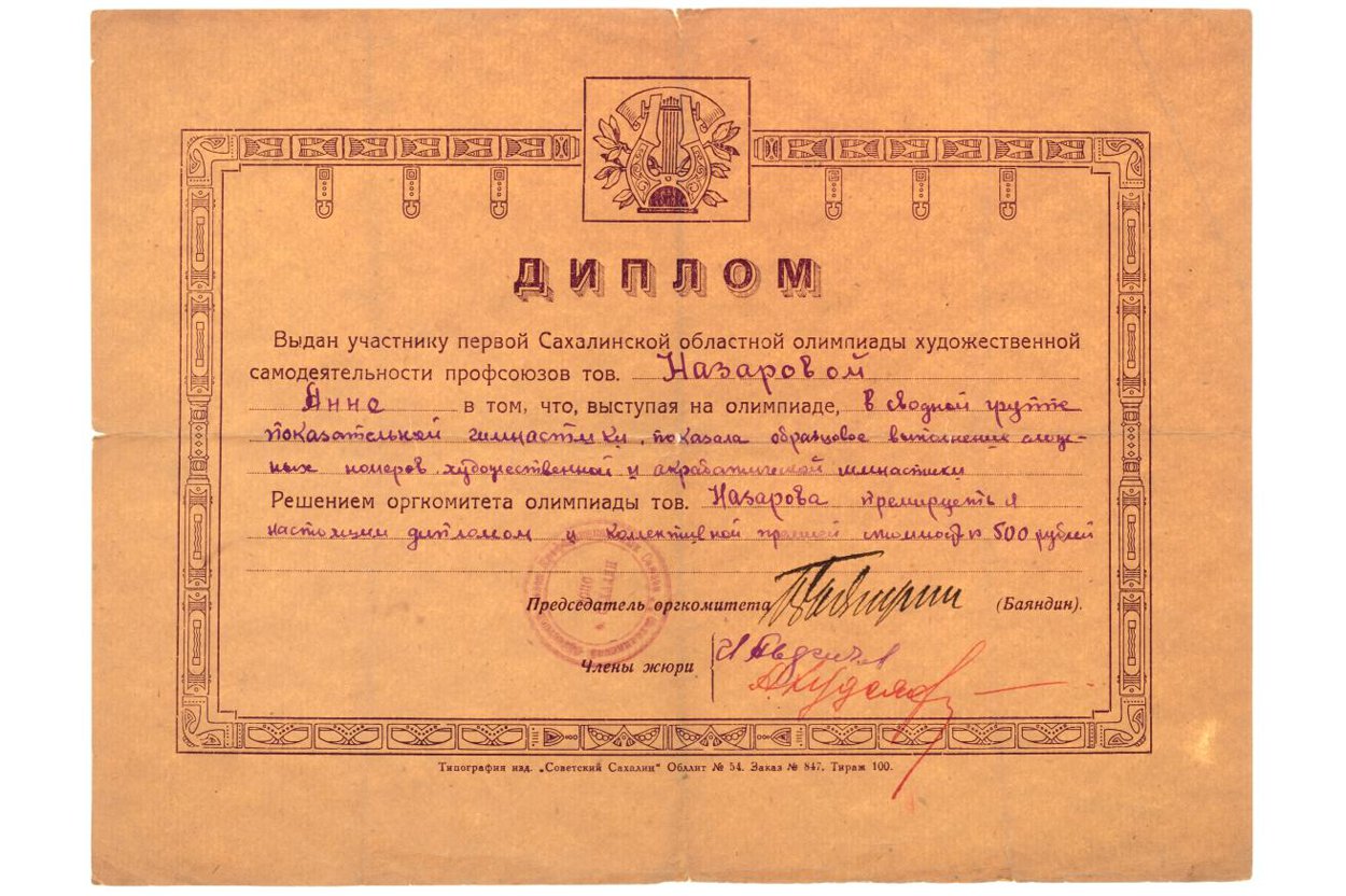На чудом сохранившейся грамоте 1936 года написано: «Диплом выдан участнику первой сахалинской олимпиады художественной самодеятельности Анне Назаровой в том, что выступая на олимпиаде в сводной группе показательной гимнастики, показала образцовое выполнение сложных номеров художественной и акробатической гимнастики».