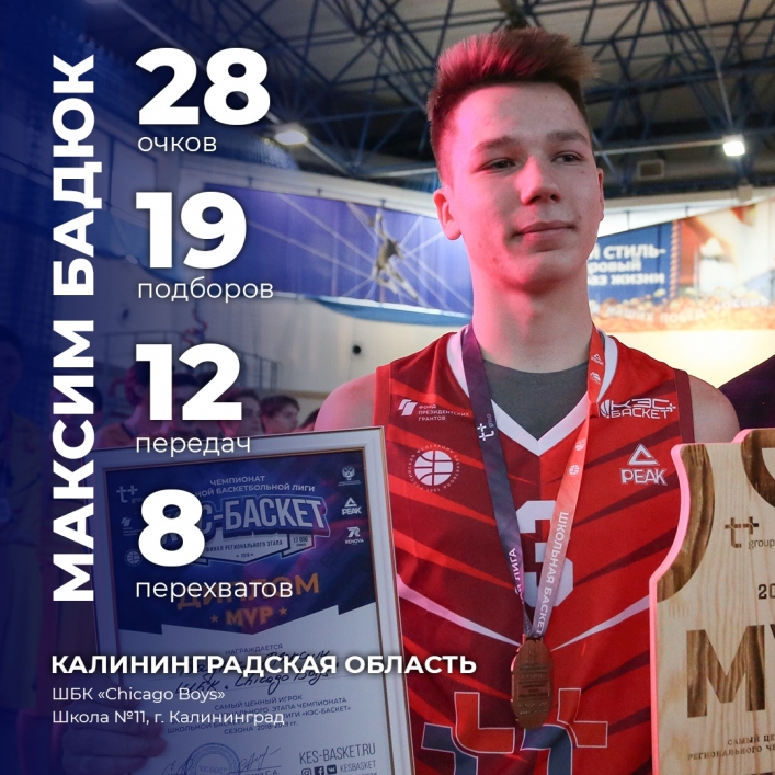 4. Максим Бадюк, MVP Чемпионата ШБЛ «КЭС-БАСКЕТ» Калининградской области (ШБК «Chicago boys», МАОУ СОШ №11, г. Калининград).