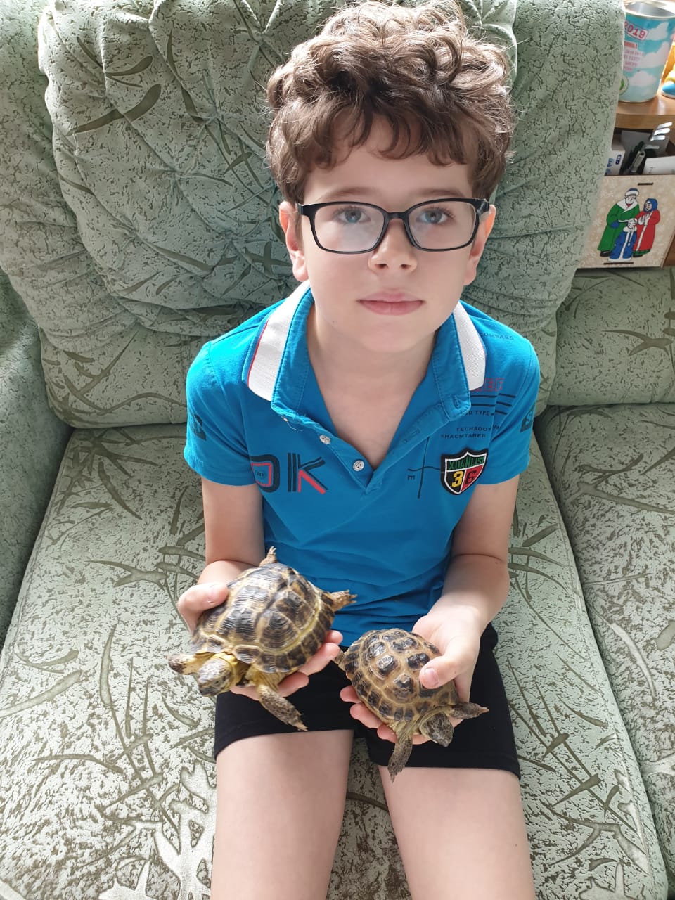 У Ярослава Трофимова дома целый контактный зоопарк. В аквариумах живут рыбки и креветка. Не так давно у Ярослава появились жуки-палочники. Их любимая зимняя пища – листья малины. Ожереловый попугай Красавчик обожает экзотические фрукты, овощи, ягоды и омлет. Компанию им составляют две черепахи (большая – Кеша, маленькая – Стружка). Они очень любят салат, фрукты, овощи. Могут есть творог и хлеб, замоченный в молоке. Ярик много ухаживает за своими любимцами и хотел бы знать ответ на вопрос: «А вы меня любите?».