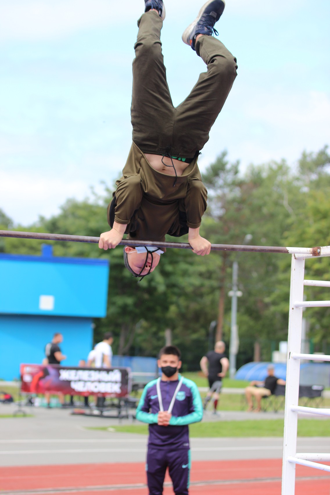 Другие участники праздника показывали мастерство на воркаут-площадке. 57-летний Вячеслав Кан сделал подъём с переворотом на перекладине ровно 100 раз, за что получил заслуженную награду.