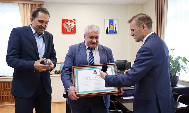 Министр спорта Сахалинской области Сергей Буренков поздравил юбиляра и вручил почетную грамоту.