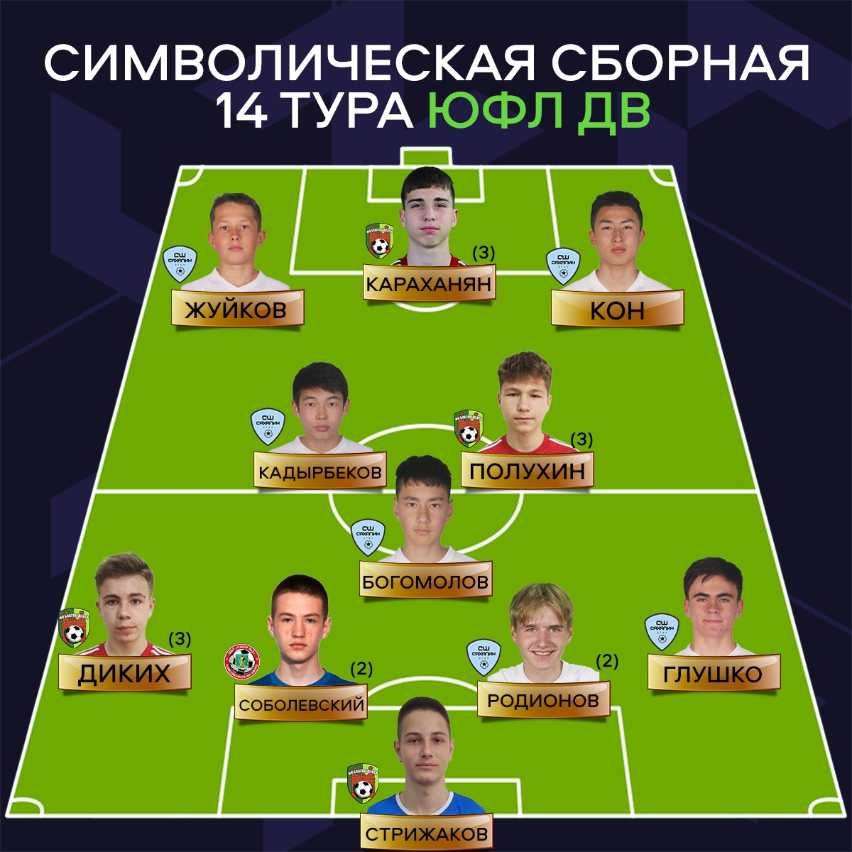 Оргкомитет дальневосточной юношеской футбольной лиги обнародовал состав символической сборной 14 тура. В нее включены шесть футболистов «Сахалина», четыре игрока ФК «Благовещенск» и один представитель СШОР № 2 (Комсомольск-на-Амуре).