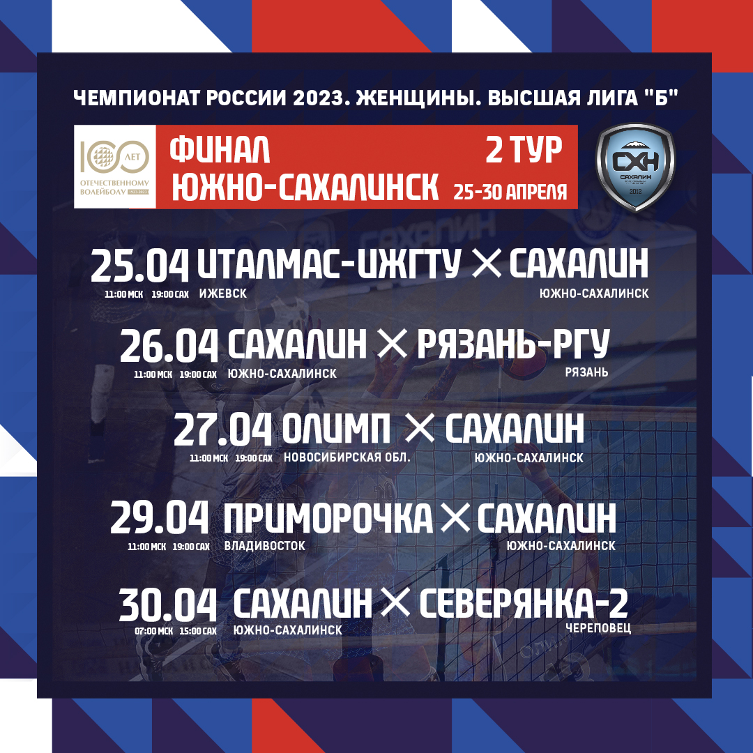 С 25 по 30 апреля в Южно-Сахалинске состоится второй (заключительный) тур чемпионата России по волейболу среди женских команд высшей лиги «Б». Шесть команд завершат борьбу за награды турнира.