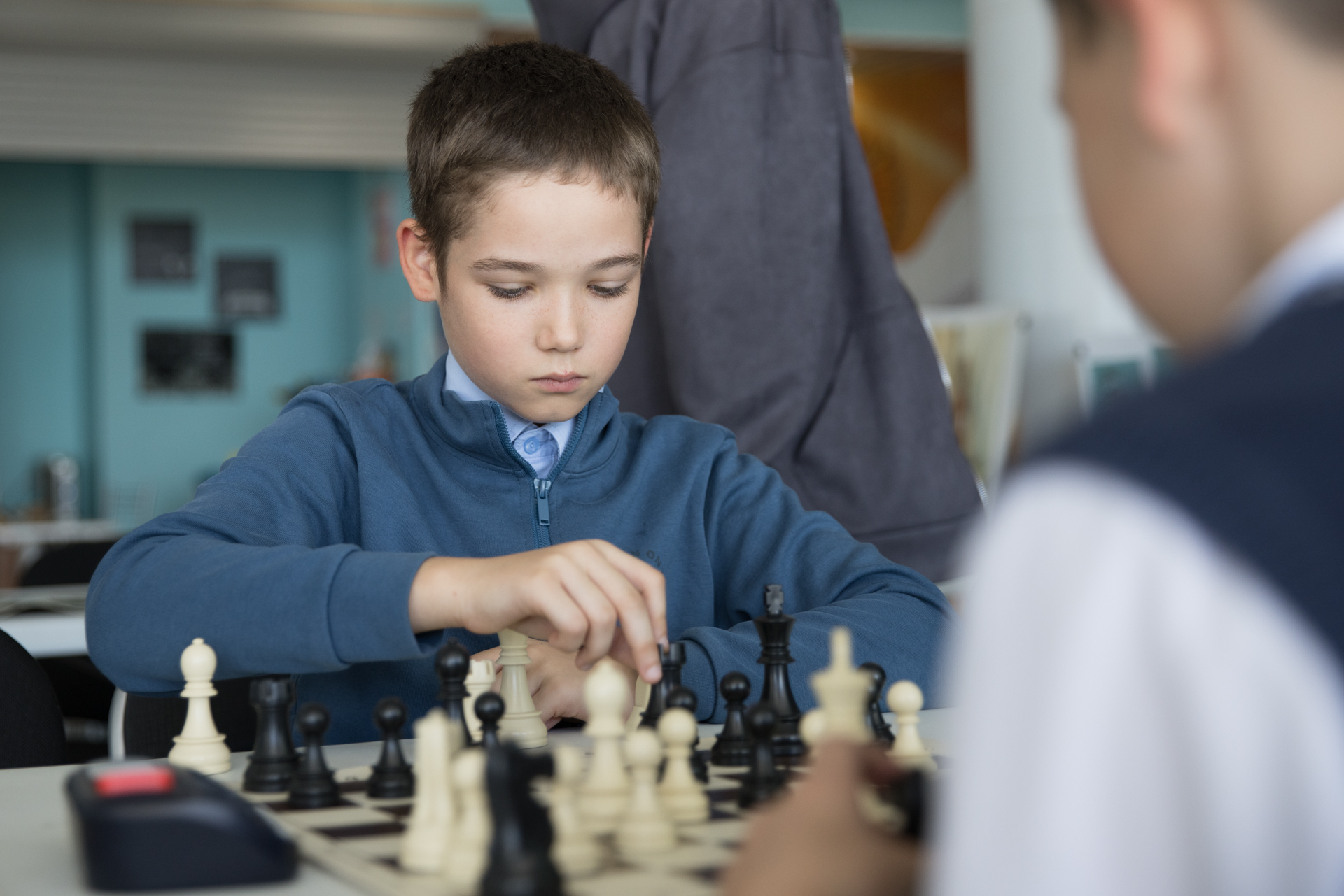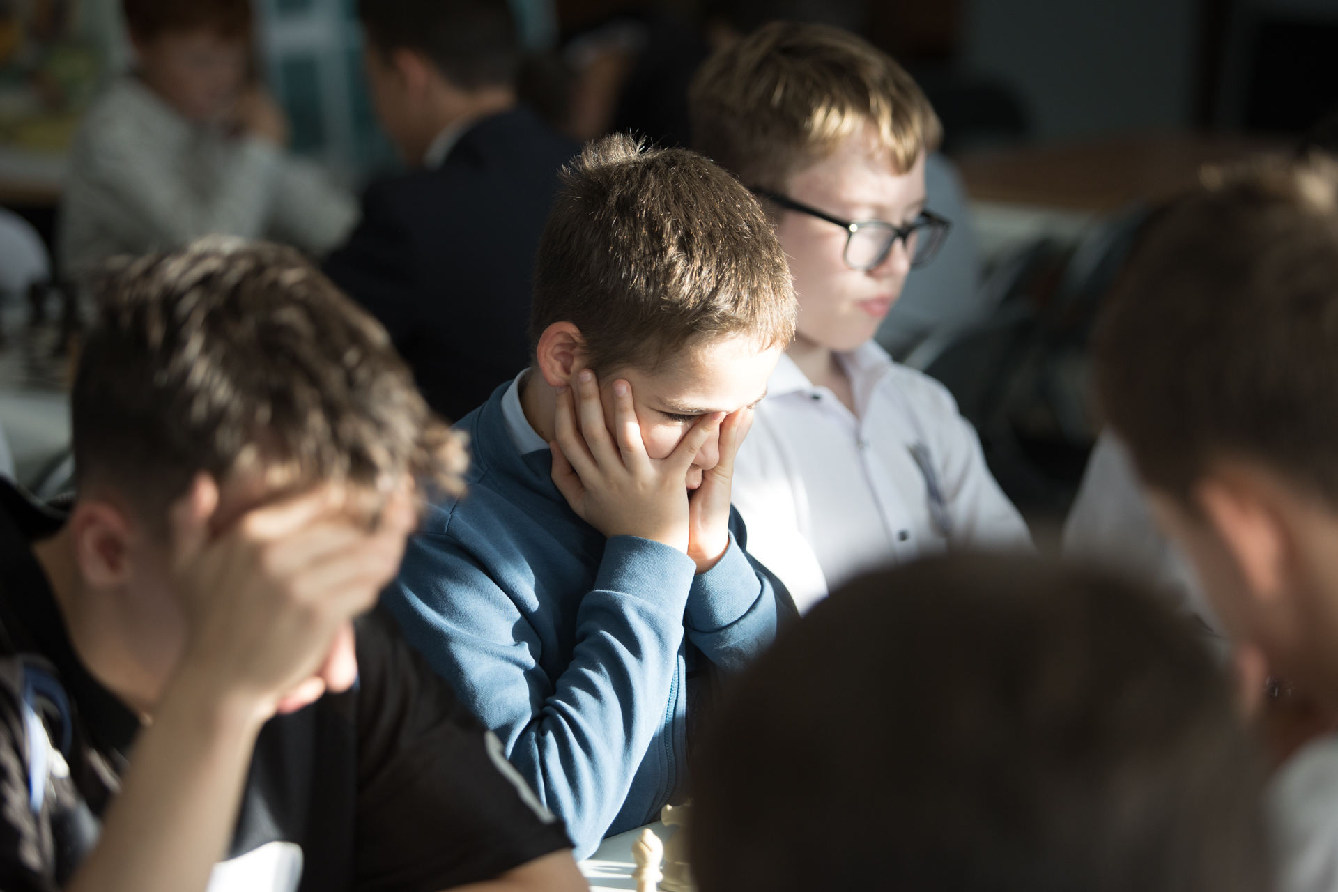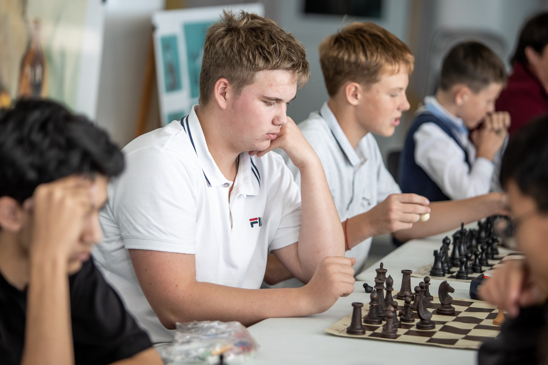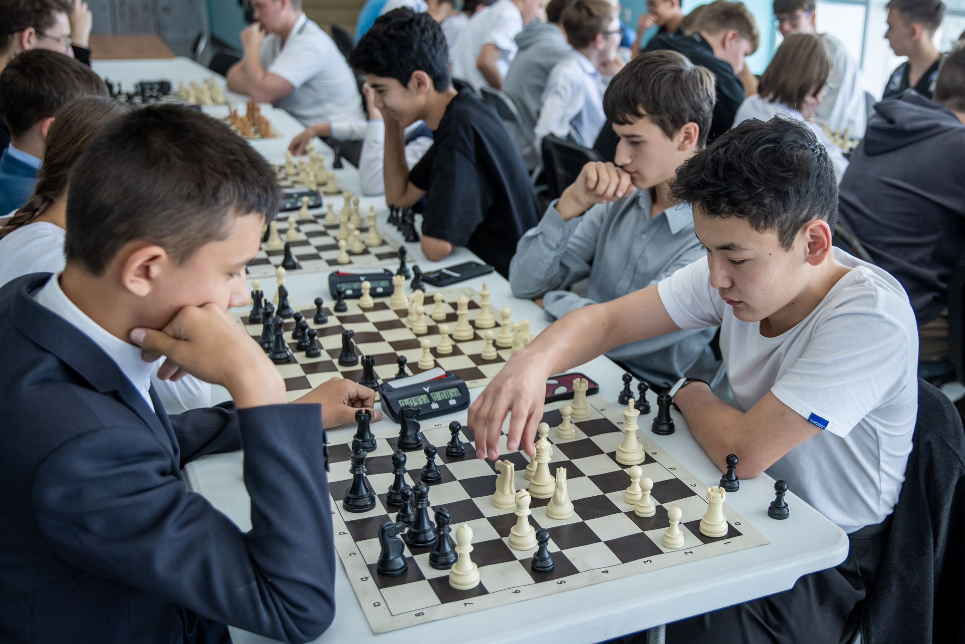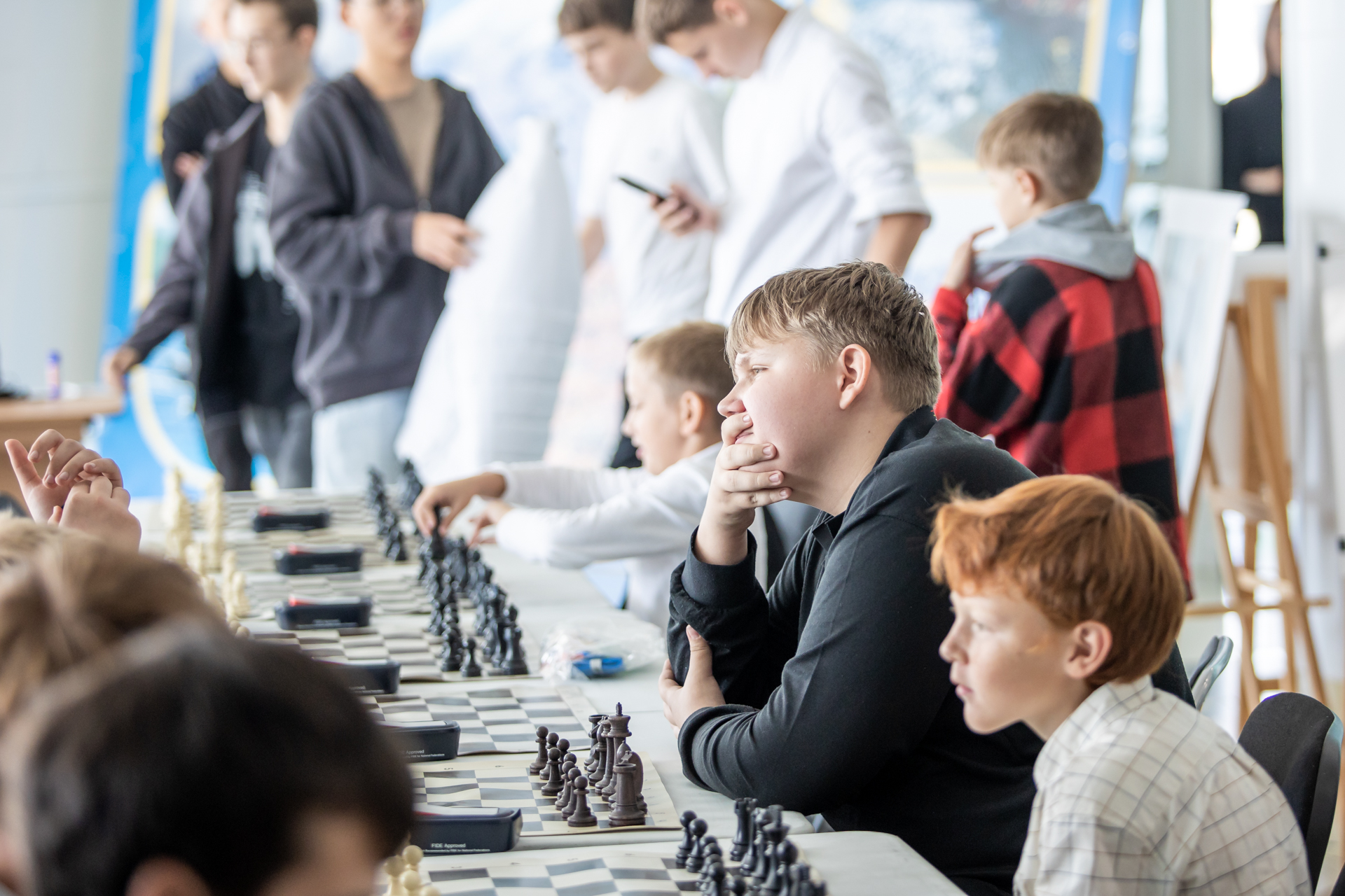 Еще одним важным событием был сеанс одновременной игры в Горном. За доски здесь в основном сели младшие школьники. Но и «старшаки» тоже подходили, чтобы сыграть с титулованным сеансёром.