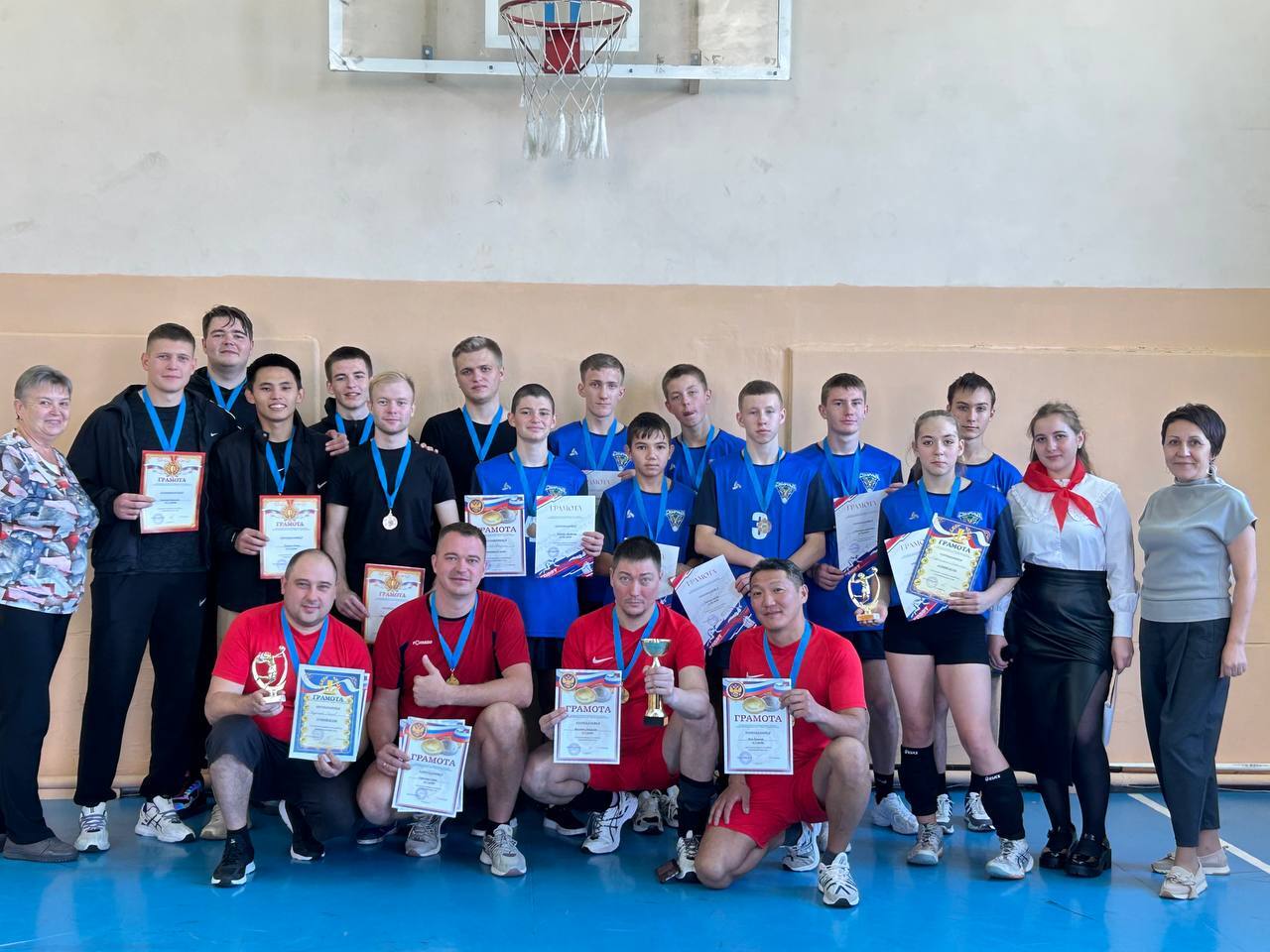 На площадку местной СОШ вышли три команды. В составе одной играли отцы волейболистов, во второй – учащиеся СОШ (они занимаются в спортивной школе Смирных), а в третьей – выпускники спортшколы.