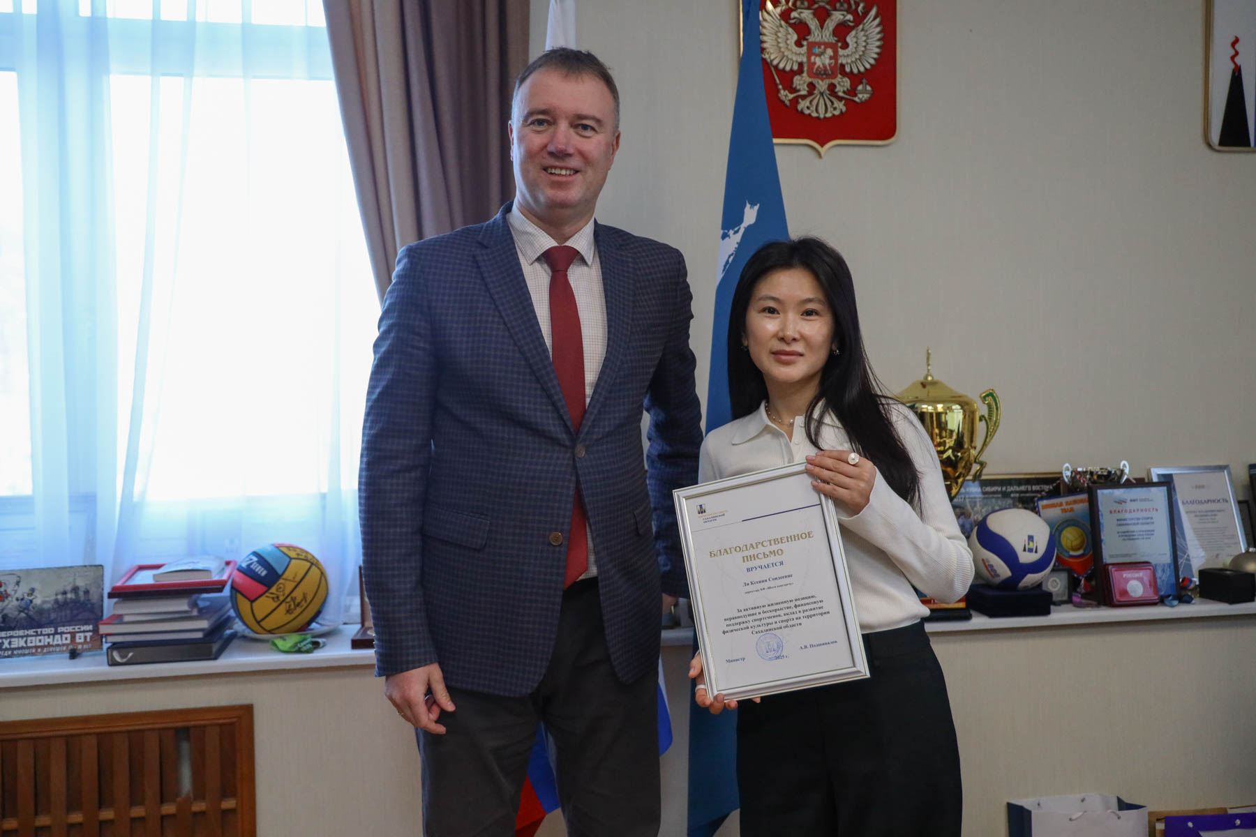 Заместитель министра спорта Сахалинской области Станислав Тюрин вручил благодарственные письма директору благотворительного фонда «Шаги навстречу» Ксении Ли и генеральному директору ООО «Би-Лоджикс» Борису Бобровскому.