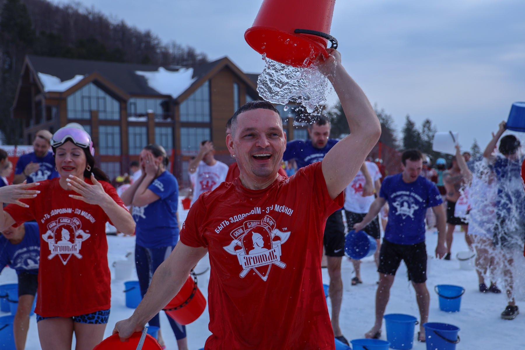 Перед обливанием сахалинцы облачились в футболки в цветах флага России и приняли участие в массовой зарядке, после чего одновременно окатились ледяной водой.