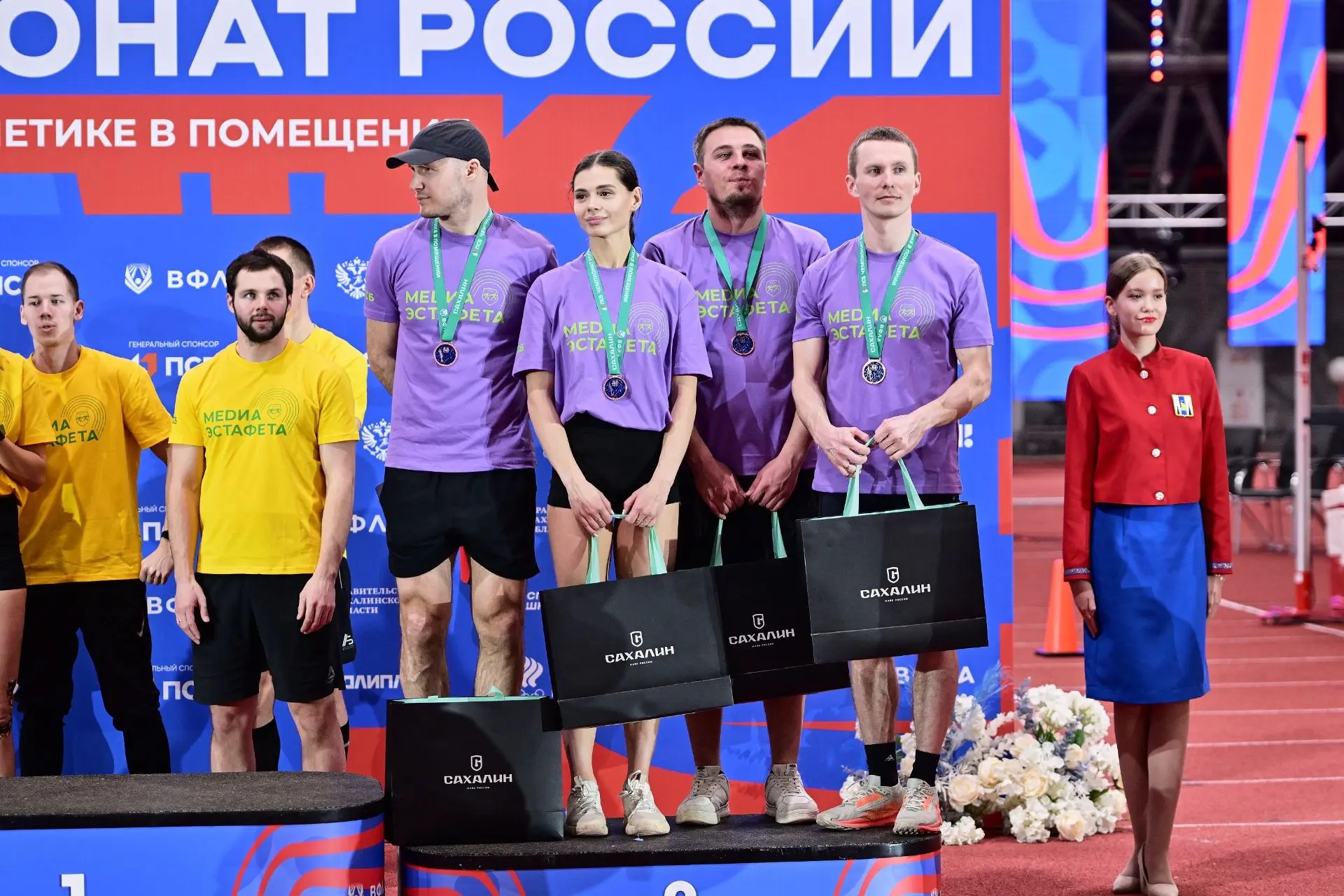 Тройку призеров замкнул фиолетовый состав: Денис Спицов, Александр Хорошилов, легкоатлетка Виктория Баркова и Дмитрий Беломестнов (СМИ).